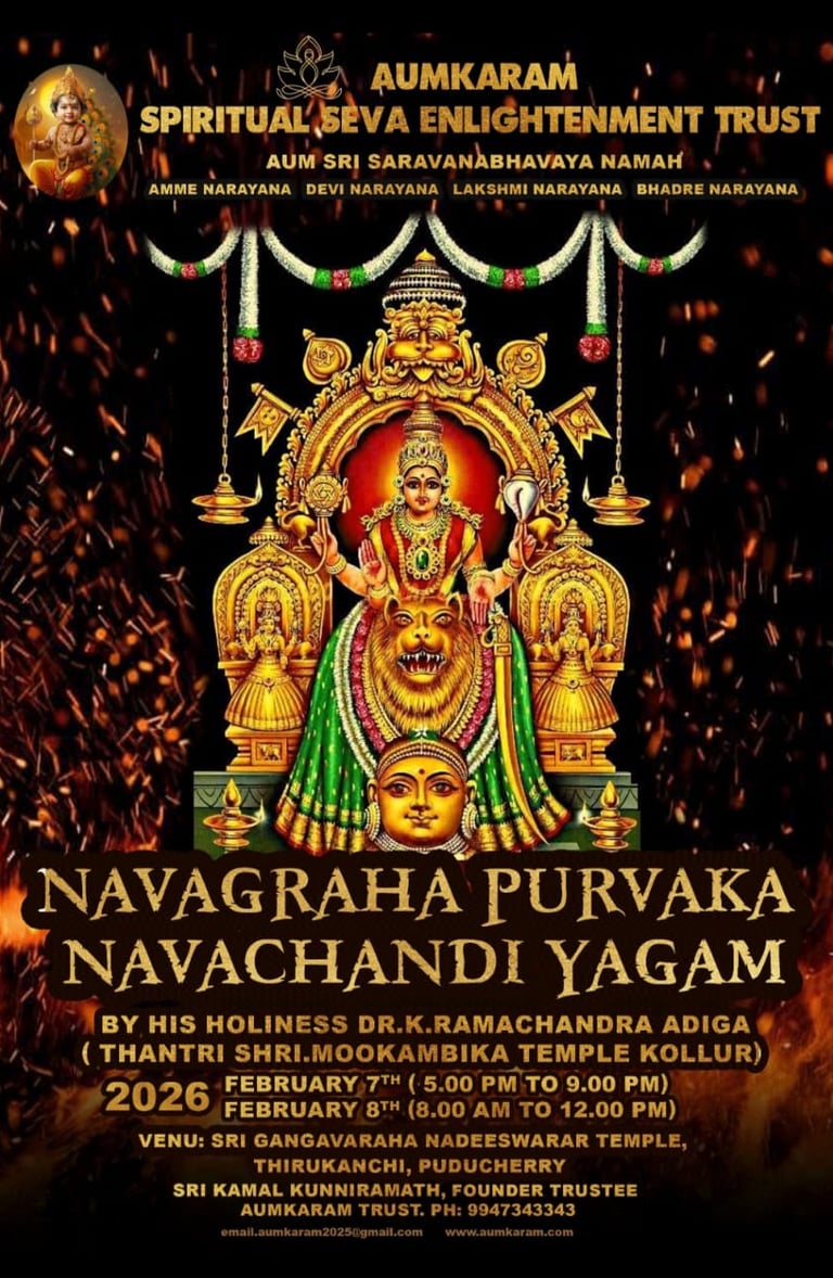 Aumkaram Spiritual Seva Enlightenment Trust is honored to organize the divine Navagraha Purvaka Navachandi Yagam, a powerful and highly revered Vedic homa dedicated to Goddess Chandi, preceded by Navagraha worship for planetary harmony and spiritual upliftment.
